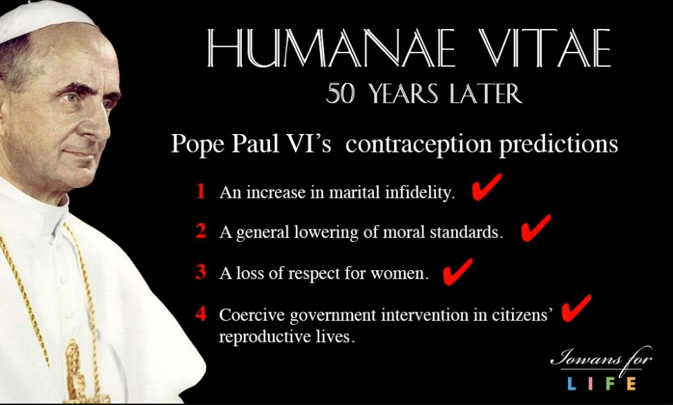 I bring this up because I wish to address one argument I have seen around on the occasion of Humanae Vitae‘s (HV) 50th birthday. This argument is, in fact, older than this birthday and resurfaces periodically in Catholic social media. This argument states that Pope St. Paul VI has been prophetic, in that he made several predictions of the social implications of allowing artificial contraception… and they all came true.